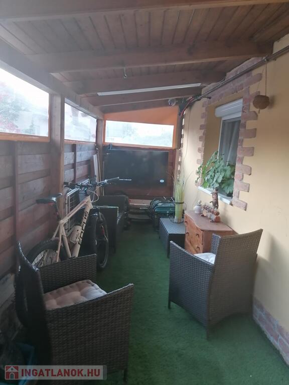 A ház előtt fedett, 15 nm-es terasz húzódik, ami ponyvával van lezárva. Itt kényelmesen lehet pihenni, nyáron hűsölni és a szabadidőt eltölteni.