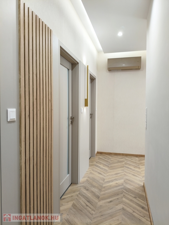 A lakás járólap és laminált padló burkolatokkal, hőszivattyús padlófűtéssel, valamint inverteres hűtő-fűtő klímával felszerelt. A 3 rétegű üvegezésű műanyag nyílászárók elektromos alumínium redőnyökkel rendelkeznek, biztosítva az energiahatékonyságot és a kényelmet.