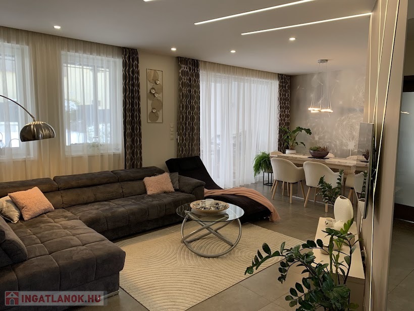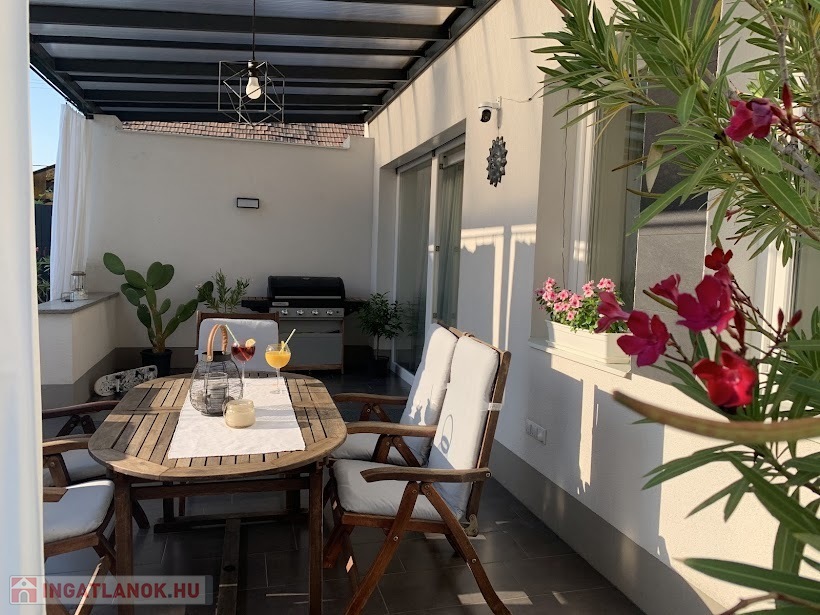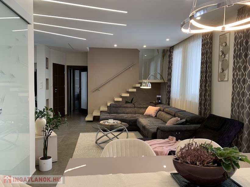 A 2018-ban épült, modern, minimalista stílusú főépület nettó 140 m² alapterületű, kétszintes kialakítású.Elrendezése: nappali + 4 hálószoba.Padlófűtéssel, 5 kW-os, szaldós elszámolású napelemes rendszerrel, elektromos redőnyökkel és egy 30 m²-es fedett terasszal rendelkezik.A kiváló szigetelésnek és korszerű gépészetnek köszönhetően a fenntartási költsége rendkívül alacsony.