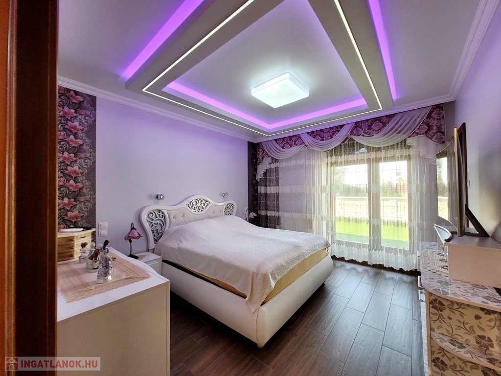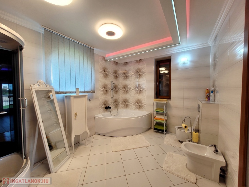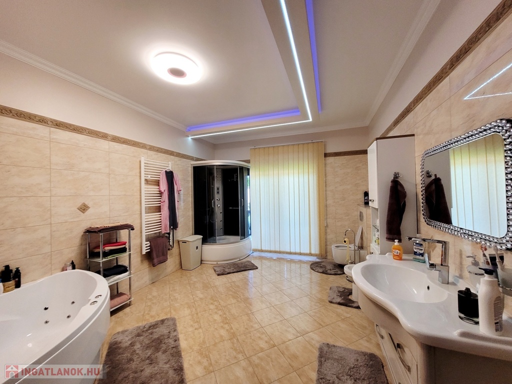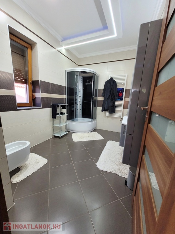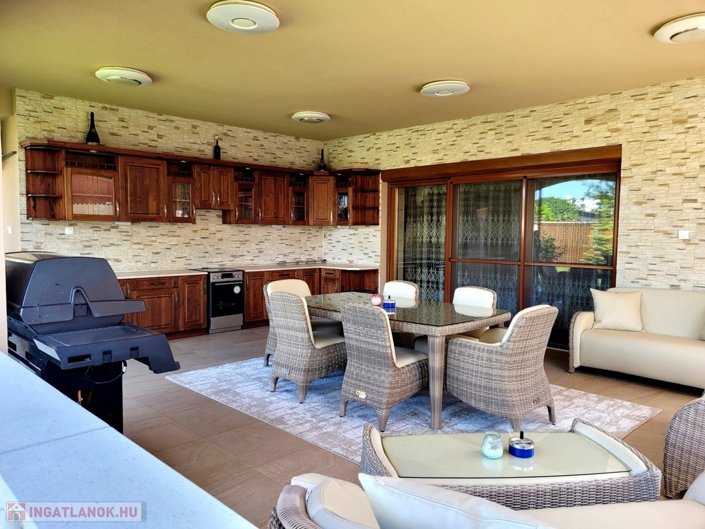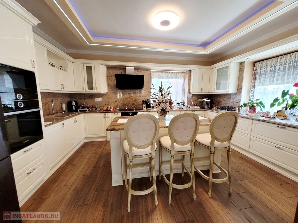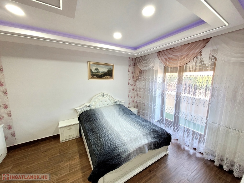 Nyíregyháza Örökösföld új lakónegyedében megvételre kínálunk egy impozáns minden igényt kielégítő 350 nm-es 5 szoba nappalival rendelkező családi házat. Az ingatlan magas minőségi burkolatokkal, beltéri ajtókkal, Sofa nyílászárókkal, melyek elektromos redőnnyel szereltek, fűtéséről egyedi gáz és padlófűtés gondoskodik. Az ingatlan alsó szintjén található : 90 nm-es Nappali, tágas konyha, 1 hálószoba 1 gardróbbal, 2 fürdőszobával, 80 nm-es 2 állásos fűtött garázs, 2 különálló tárolóhelyiséggel, valamint a gépházzal. A világos nappaliból egy tágas 45 nm-es nyugati fekvésű teraszra érkezünk, ahol egy különálló konyha is kialakításra került a kinti szabadtéri programokhoz. A felső szinten 4 hálószoba, 2 fürdőszoba, 2 gardrób, valamint egy mosóhelyiség került kialakításra. A hálószobák egy 140 nm-es egylégterű teraszra nyílnak, , ahonnan panoráma kilátásban van részünk. Az ingatlan további jellemzői: a szobák hűtő -fűtő klímával, kamera rendszerrel felszereltek, 1300 nm-es automata öntözőrendszerrel gyönyörű parkosított kert és tárolók. A mindennapokat több szinten kielégítő családi otthon akár álmai otthonává válhat. Az ingatlan azonosítója: 94120Érdeklődni: +36709442086 Az ingatlan azonosítója: 94120 Érdeklődni: +36709442086