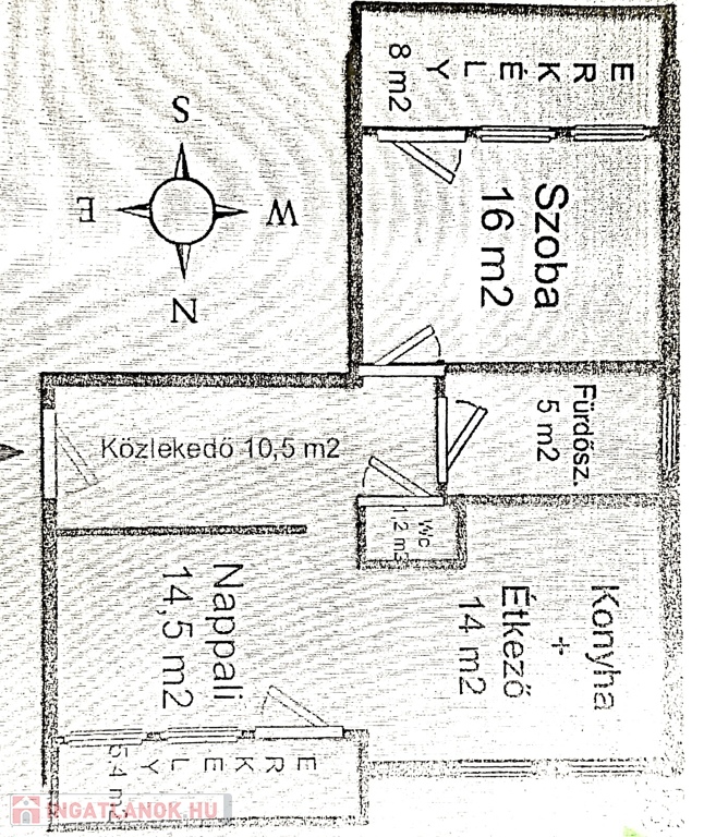 A lakás elosztása: tágas nappali + hálószoba, konyha étkezővel, fürdőszoba és WC külön helyiségben, előszoba, valamint két nagy méretű erkély (8 m² és 6 m²), amelyek igazi ritkaságnak számítanak a környéken.