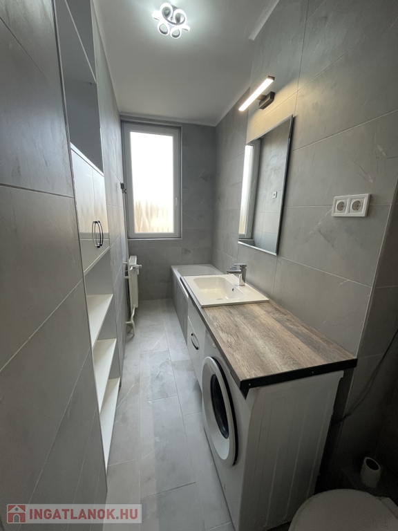 A tágas loggia tovább növeli a komfortérzetet, a folyosón található beépített szekrény pedig praktikus tárolási lehetőséget biztosít. Az ízlésesen kialakított fürdőszoba mosógéppel felszerelt.