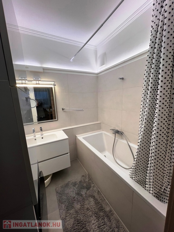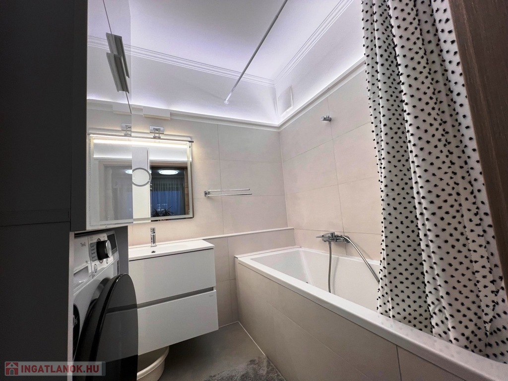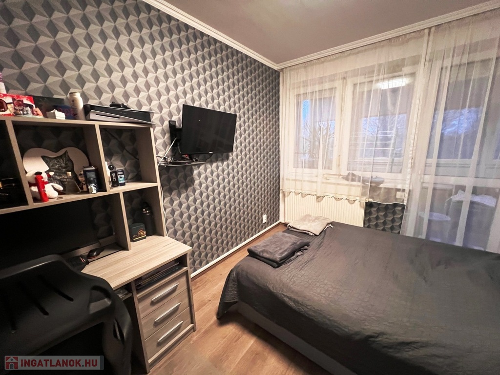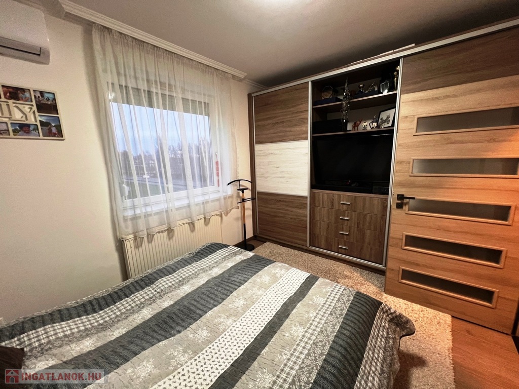 A lakás elrendezése praktikus és élhető: tágas nappali étkezőrésszel, külön nyíló két hálószoba, gardrób, konyha, fürdőszoba, külön helyiségben található WC, valamint egy zárt erkély biztosítja a kényelmet. Az otthon műanyag nyílászárókkal, redőnnyel, klímával és riasztóval felszerelt, a burkolatok igényesek, a szobákban laminált padló, a többi helyiségben járólap található. A házközponti fűtés egyedi mérővel szabályozható, így a fenntartási költségek tervezhetőek.