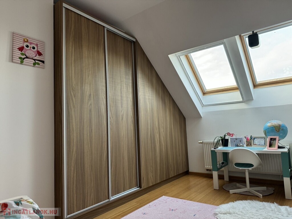 Az alsó szinten amerikai konyhás nappali, külön szoba, tágas fürdőszoba, külön WC és egy praktikus dolgozósarok kapott helyet. Az egyedi tervezésű, prémium belső lépcső a lakás egyik meghatározó eleme. A felső szinten 2 teljes értékű szoba és egy fürdőszoba WC-vel található.