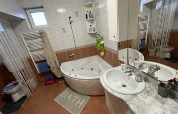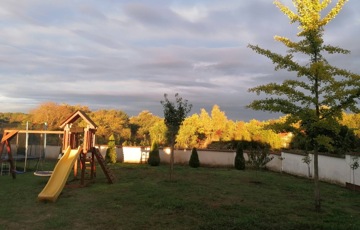 A telek adottságai:Az 1014 m²-es telek gondozott, részben térkövezett, részben parkosított és díszfákkal beültetett. A kert kényelmét automata öntözőrendszer, egy külön filagória, játszótér és egy plusz fedett autóbeálló növeli.