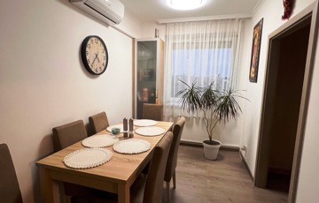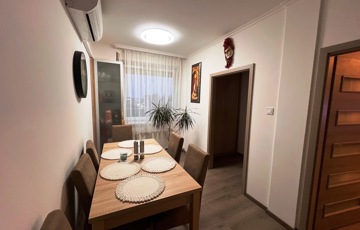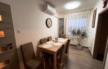A lakás elrendezése praktikus és élhető: tágas nappali étkezőrésszel, külön nyíló két hálószoba, gardrób, konyha, fürdőszoba, külön helyiségben található WC, valamint egy zárt erkély biztosítja a kényelmet. Az otthon műanyag nyílászárókkal, redőnnyel, klímával és riasztóval felszerelt, a burkolatok igényesek, a szobákban laminált padló, a többi helyiségben járólap található. A házközponti fűtés egyedi mérővel szabályozható, így a fenntartási költségek tervezhetőek.